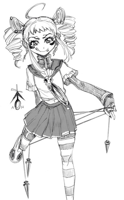 이 외에도 붉은 블리치가 들어간 검은 머리와 흑백의 스카잔 복장은 특이하게도 최근작인 <마지스카 학원>(マジすか学園; 2010)의 등장인물 블랙(ブラック)에게서 따온 것으로 보인다. 사진. 이쪽도 학원을 배경으로 한 작품에, 스케반이나 사천왕 등이 등장한다는 공통점이 있다. 그리고 옷이 캐릭터가 되어 주인공과 대화한다는 점은 1970년의 개그 만화였던 <명랑 개구리 뽕키치>와 닮았다.