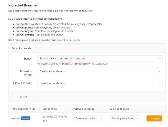- GitLab Project -> Settings -> Repository -> Protected Branches -> [Expand] 버튼 클릭