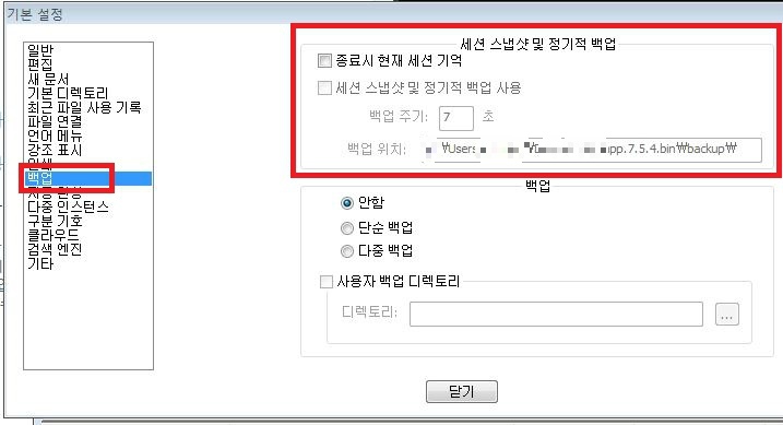 ▼ '기본 설정' 팝업창이 띄면 왼쪽메뉴의 [백업] 선택 하면 세션 및 백업 항목을 볼 수있습니다. 이 옵션들 덕에 굳이 저장하지 않아도 되는 것입니다.