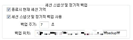 ▼"세션 스냅샷 및 정기적 백업" 항목을 먼저보겠습니다. -종료시 현재세션 기억 : 옵션이 체크되어 있으면 종료할때 저장이됩니다. -세션 스냅샷 및 정기적 백업 사용 : 옵션이 체크되어 있으면 지정해놓은 주기별로 설정한 위치에 자동 저장이 됩니다.