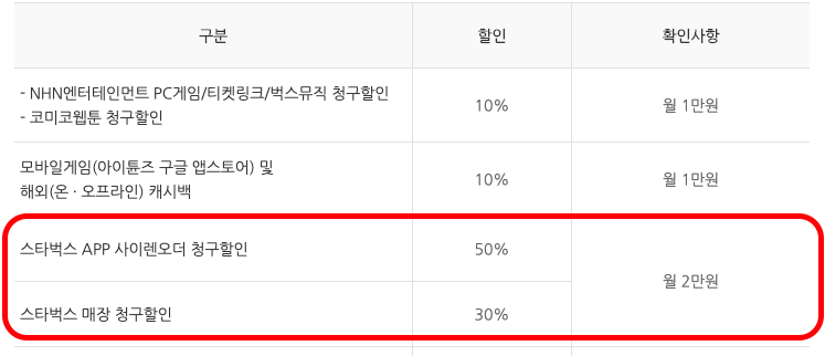 여러 혜택 중 스타벅스 앱 사이렌오더 50% 청구할인이 되는것을 알 수 있습니다. (단, 월 할인한도 2만원)