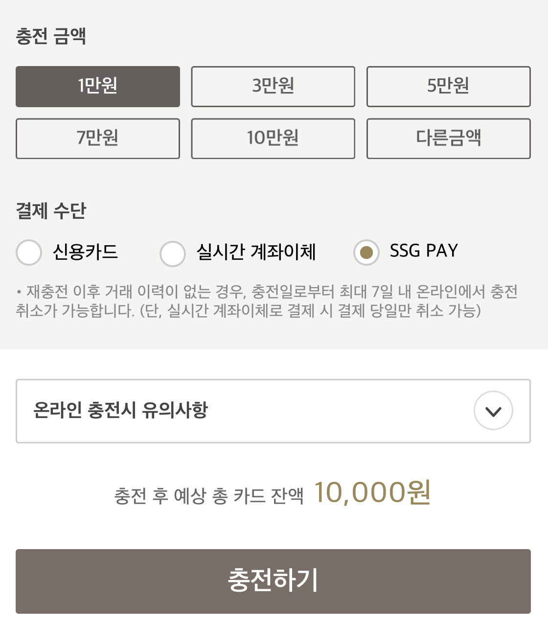 먼저, 스타벅스 앱에서 보유한 카드에 SSG PAY로 충전을 합니다.