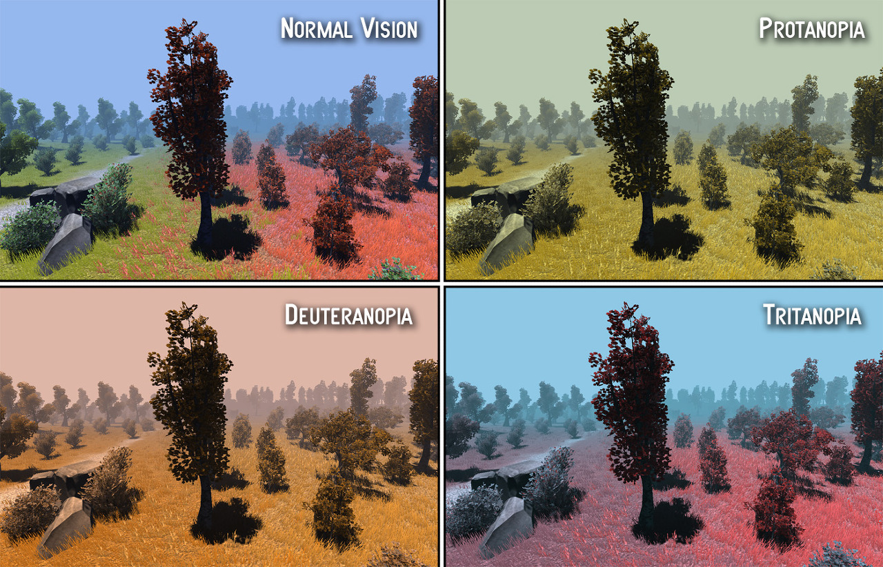 Up to 8% of men (and about 0.5% of women) are affected by some type of color vision deficiency. Use this plugin to help you design better user experience and see how is your game perceived by colorblind people.