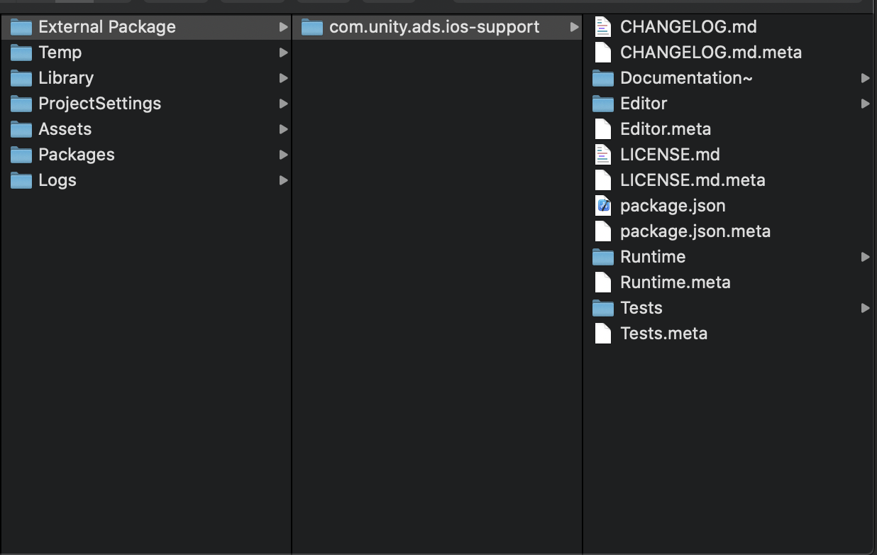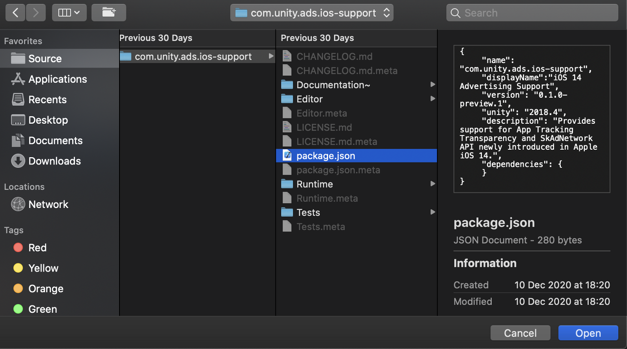 Then press the plus button and add from disk and navigate to the package.json file within the com.unity.ads.ios.support that we just unzipped.