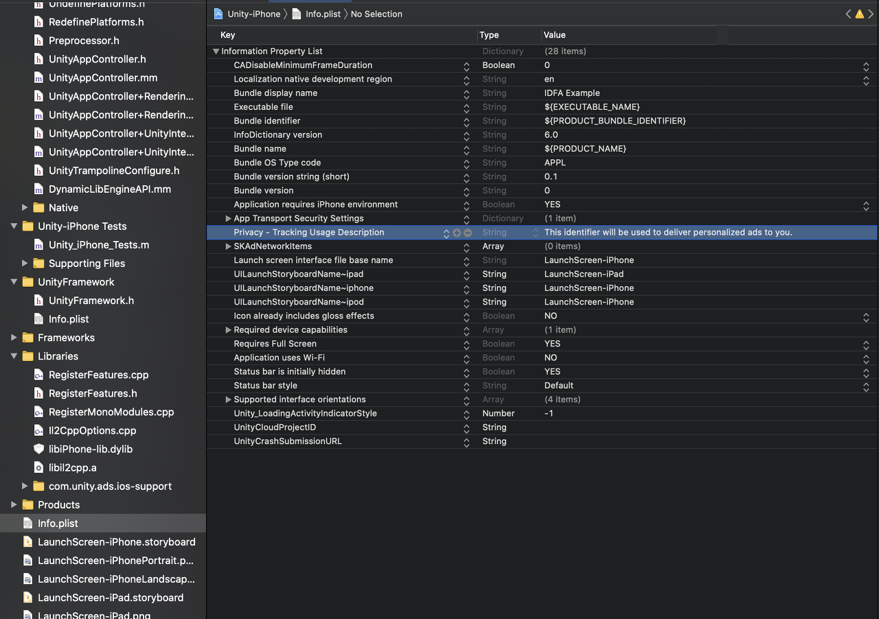 Like any other permission request Apple requires a description on why you are requesting these permission. For this we need to add the NSUserTrackingUsageDescription key to our PList. Instead of having to do this each time we create a build we are going to create a post build step that automatically adds it to the XCode Project