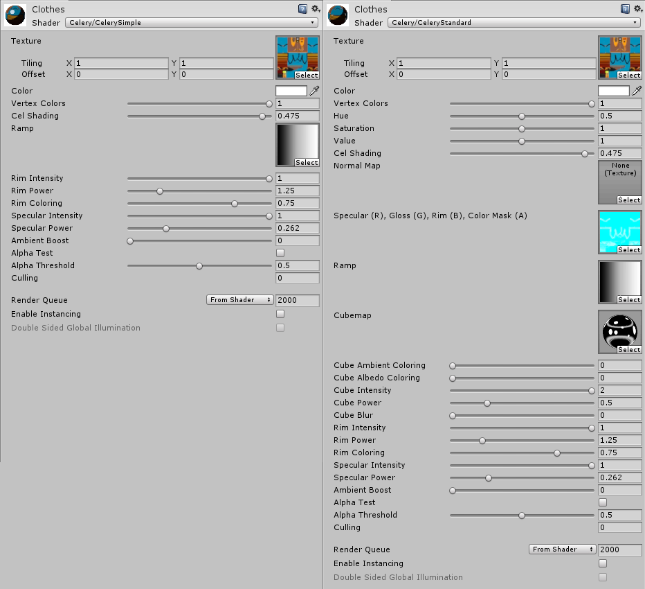 Supports vertex colors, HSV adjustment with color masking, specular/gloss maps, normal maps, alpha testing, alpha blending (separate material), vertex-displaced outline (integrated in the same material or as a separate shader) as well as some custom ambient lighting