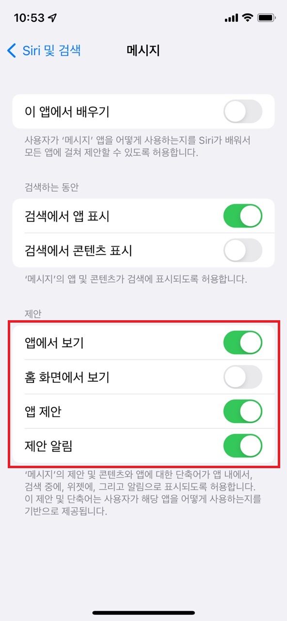 3) 설정-Siri 및 검색-(화면 아래로 내려서)메시지