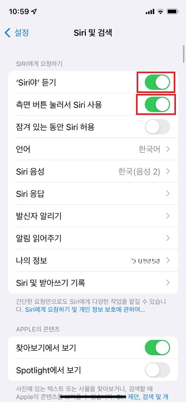 2) 'Siri야' 듣기, 측면 버튼 눌러서 Siri 사용 : 끄기