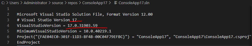 This is a partial screenshot of two sln files, the upper one was created by Visual Studio 2019, and the lower one was created by Visual Studio 2022.
