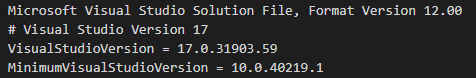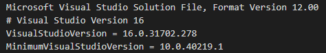 The full version of Visual Studio that (most recently) saved the solution file. If the solution file is saved by a newer version of Visual Studio that has the same major version, this value is not updated so as to lessen churn in the file.