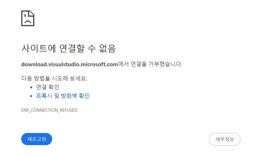 1) MSDN에서 Visual Studio 2022(https://visualstudio.microsoft.com/ko/thank-you-downloading-visual-studio/?sku=enterprise&channel=Release&version=VS2022&source=VSLandingPage&cid=2030&passive=false)를 다운받으려는데 아래와 같이 '사이트에 연결할 수 없음'이라고 뜨면서 다운이 안됨.