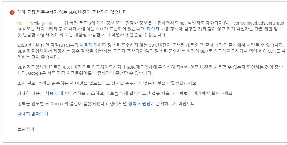 [구글스토어] 개인 정보 또는 민감한 정보를 수집하면서도 null 식별자로 제한되지 않는 com.unity3d.ads:unity-ads SDK 또는 라이브러리 중 하나가 사용하는 SDK가 포함되어 있습니다.