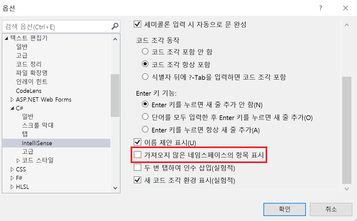 2) Visual Studio - 도구 - 옵션 - 텍스트 편집기 - C# - Intellisense - '가져오지 않은 네임스페이스의 항목 표시' 끄기