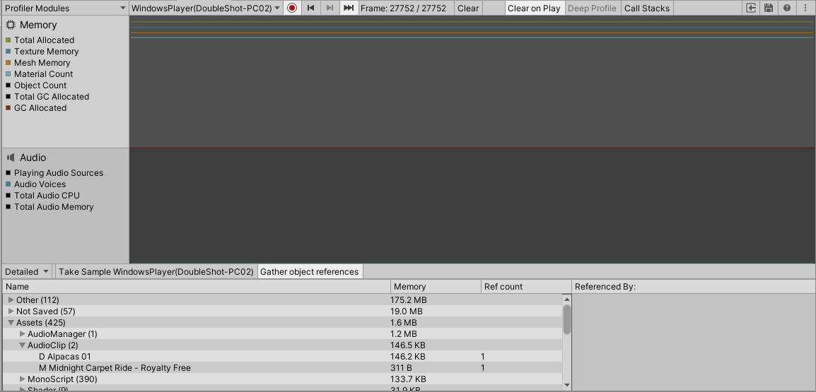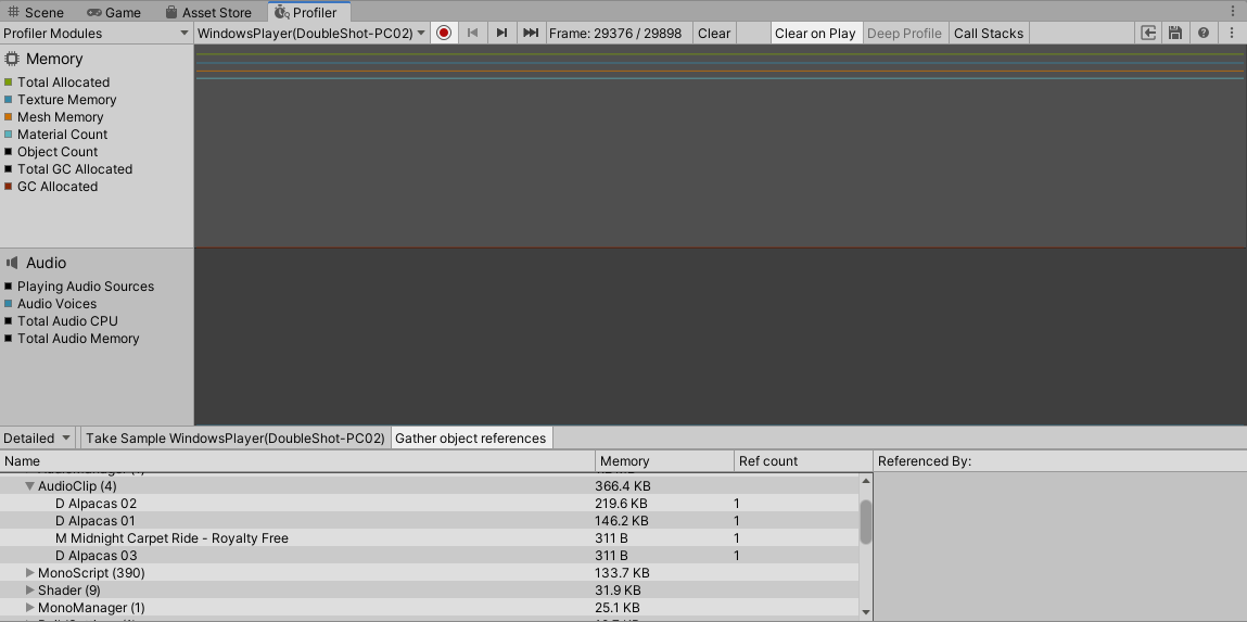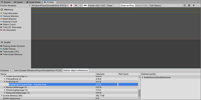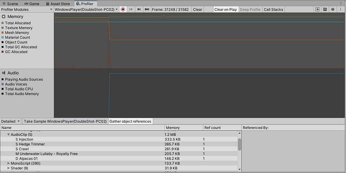 We see here that all but one of our AudioClips from the first scene are already unloaded from the memory, leaving only the one that is used again in the second scene.