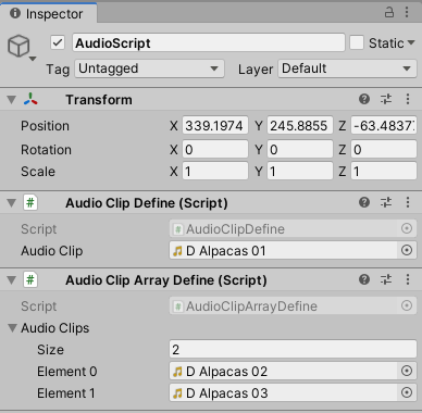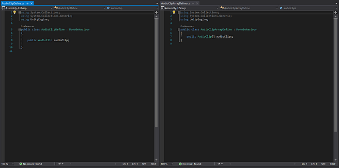 These two scripts do nothing but define a public AudioClip variable and a public AudioClip array. Let’s add an AudioClip to that and profile this.