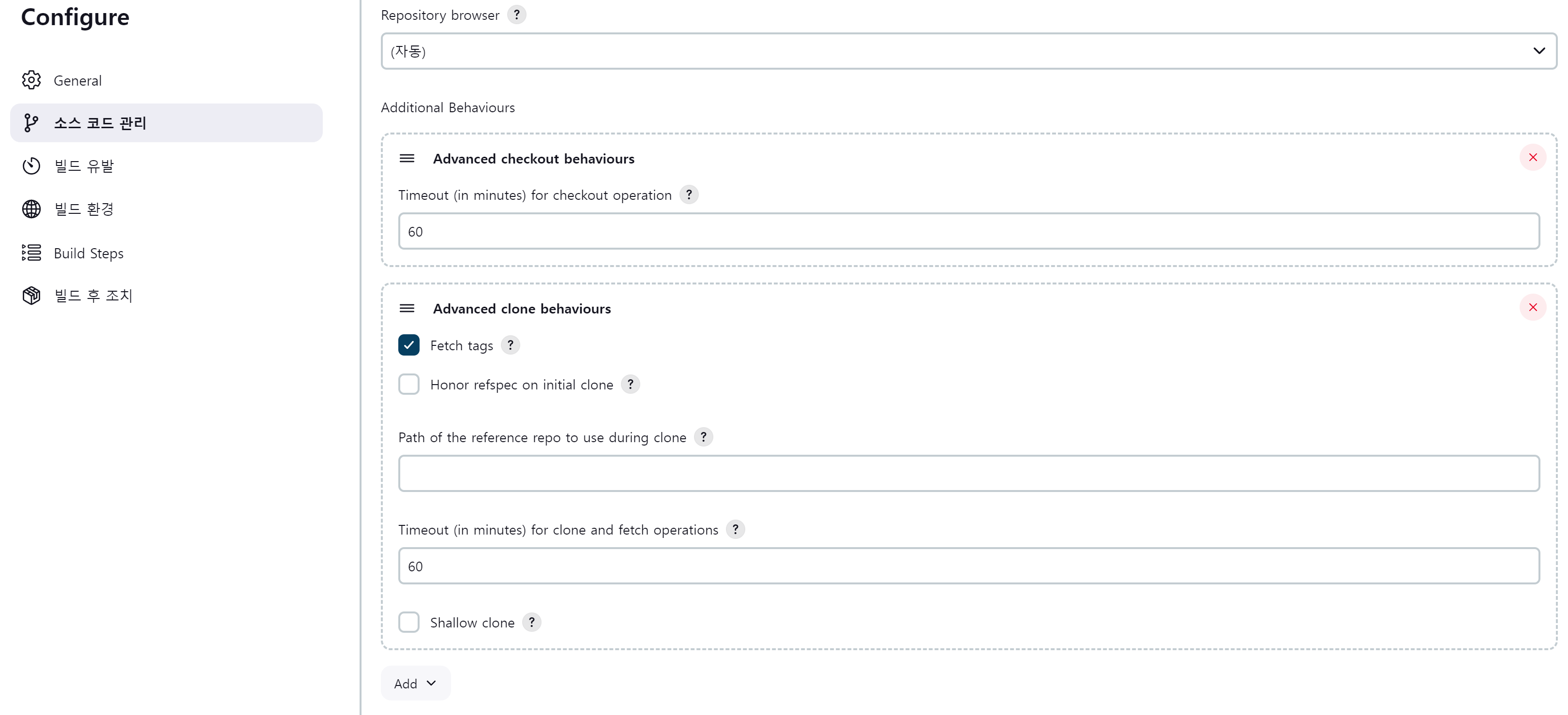 - Jenkins 관리 > {My Project} > 구성 > 소스 코드 관리 > Git > (하단)Add > Advanced checkout behaviours > Timeout (in minutes) for checkout operation > 60(min)