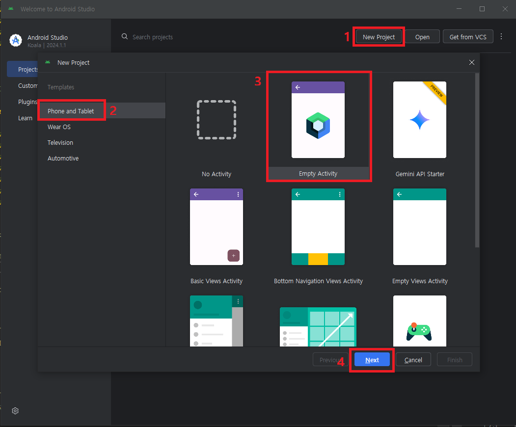 3. Activity 아무거나 선택(New Proejct 창이 뜨면 기본적으로 Phone and Tablet - Empty Activity가 골라져 있음)