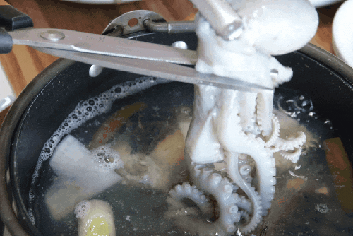 복샤브를 하기 전 낙지를 퐁당 담갔다 금방 꺼냅니다. 먹물을 안터뜨리고 살짝살싹 익혀줍니다 . 낙지는 넘어진 황소도 벌떡 세울 만큼 좋다고 하쟎아요 ㅎㅎ