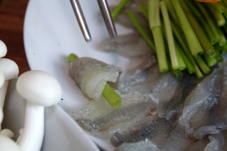 버섯과 미나리등 야채를 샤브샤브 육수에 넣어서 풍미를 더하구요..Let's go~~ 복어살을 하나 육수에 2~3번 퐁당퐁당!! 오래 하실 필요없어요.
