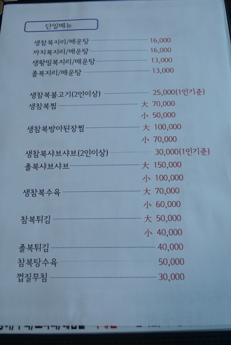 저희는 이날 생 졸복샤브샤브를맛보았답니다 (메뉴에는 없어요. 요건 특별메뉴~) 복요리 외에도 계절메뉴가 많아요 복어는 사철 머글수 있지만, 가을부터 이듬해 봄 까지가 맛있다 하십니다 설 무렵에는복어쑥국도 별미라 하시네요