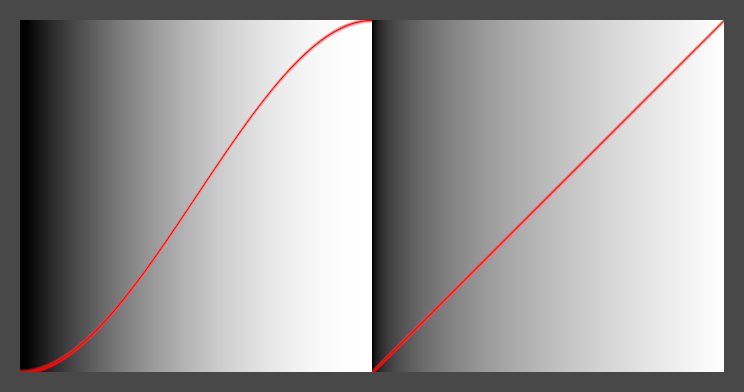 Comparison betweensmoothstep(left) and a linear function (right). The values are mapped to the greyscale background, as well as the curves in red.