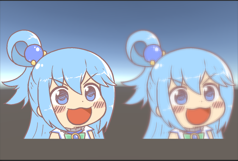 Supports vertex colors, HSV adjustment with color masking, specular/gloss maps, normal maps, alpha testing, alpha blending (separate material), vertex-displaced outline (integrated in the same material or as a separate shader) as well as some custom ambient lighting