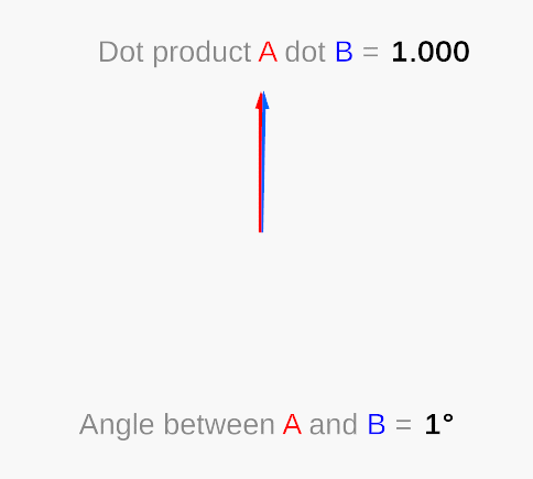 The dot product takes in two vectors (of any length) and returns a single number. When the vectors are parallel in the same direction and areunit vectors(vectors of length 1), this number is 1. When they are perpendicular, it returns 0. As you move a vector away from parallel—towards perpendicular—the dot product result will move from 1 to 0non-linearly. Note that when the angle between the vectors isgreater than 90, the dot product will be negative.