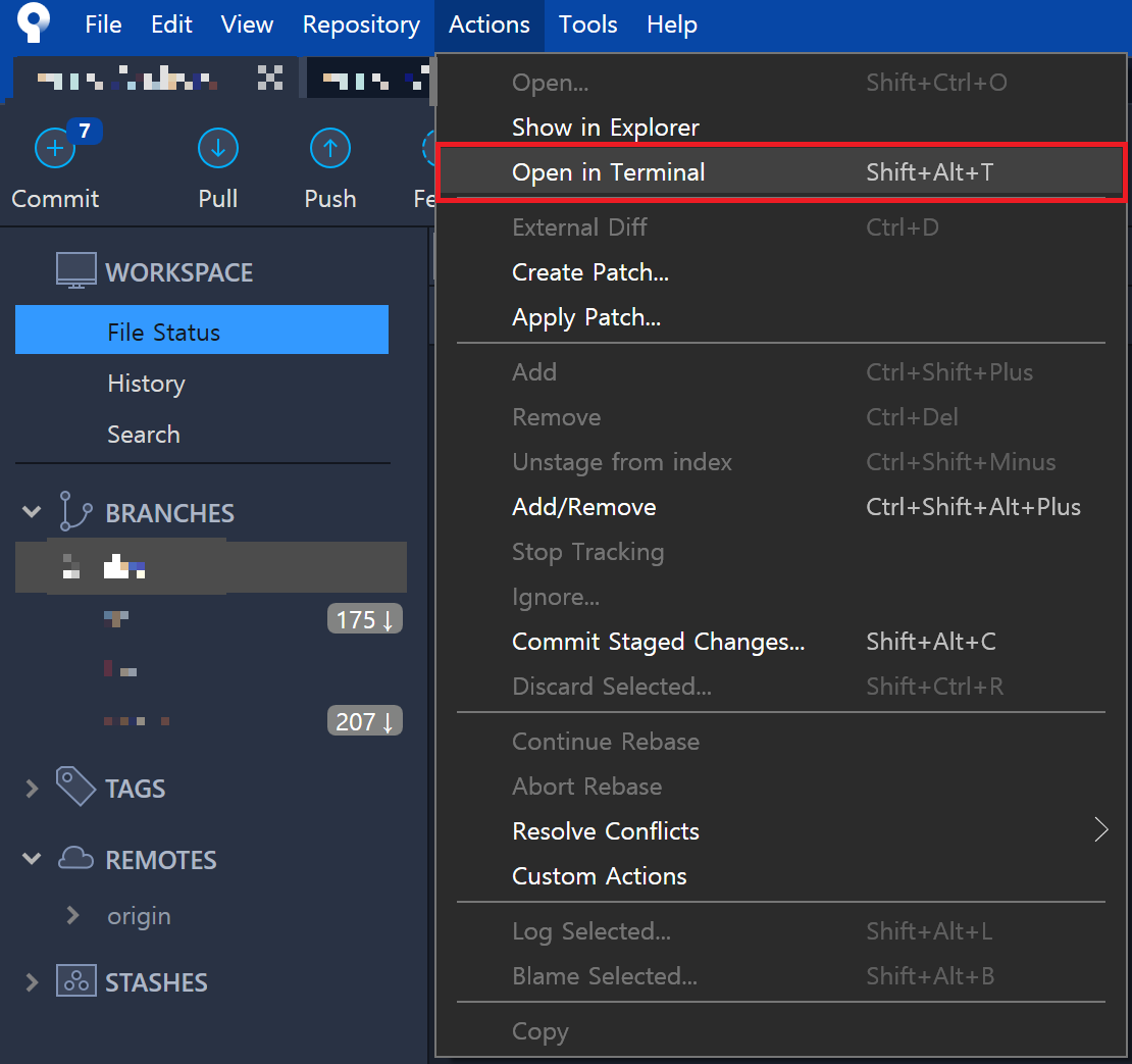 1) 소스트리 터미널 열기(SourceTree > Actions > Open in Terminal)