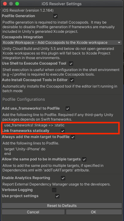 'Assets-External Dependency Manager-iOS Resolver-Settings-Link frameworks statically'에 체크(v) 해서,