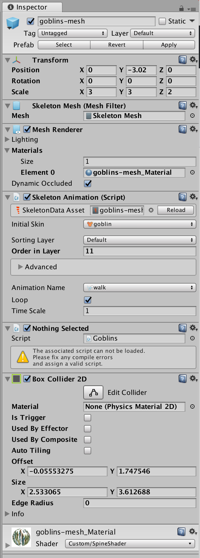 Spine 개체는 Unity에서 말하는 MeshRenderer로 렌더링되고 있습니다.