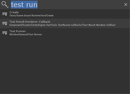 Each menu items in Unity is available for search. You can execute the menu item from the Quick Search Tool. This is especially useful to pop that elusive Test Runner or the Profiler!