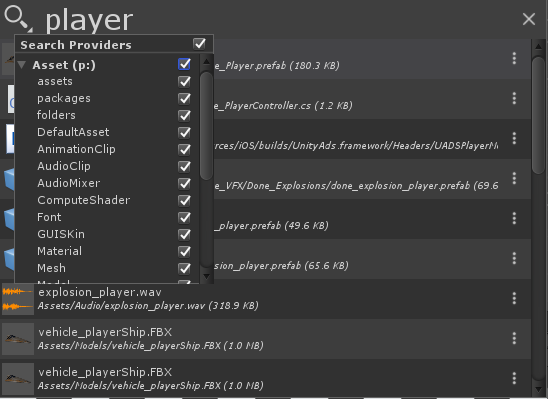 By default anSearchProvidermust have a type (ex: asset, menu, scene...) that is unique among providers and a display Name (used in the Provider filter dialog).