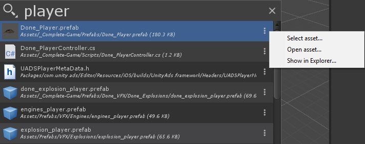 All assets in the current project are available for search. From an asset you can apply the following actions: