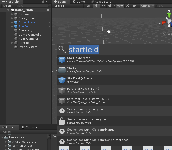 Using the shortcutAlt + 'or theHelp -> Quick Searchmenu will bring out the Quick Search Tool. This extensible tool allows you to search over multiple area of Unity.